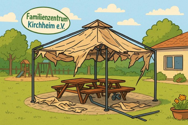 Durch sein Alter und die langjährige Witterungseinwirkung ist er so stark beschädigt, dass er nicht mehr repariert werden kann. Der Pavillon ist für uns jedoch ein zentraler Bestandteil des Außengeländes: Er spendet Schatten an heißen Sommertagen, bietet Schutz bei Regen und wird für zahlreiche Aktivitäten wie Elterncafés, Spielangebote, Feste und Gruppen genutzt.